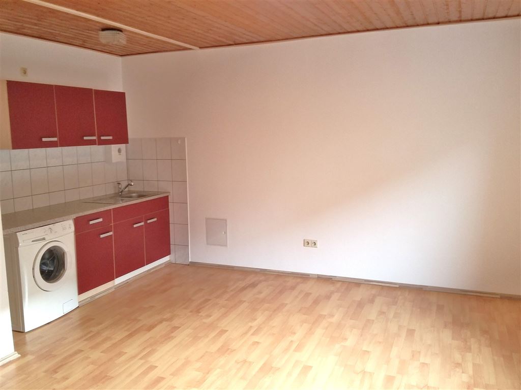 Singlewohnung in Göllheim mit offenem Wohn-/Schlafzimmer mit Küchenzeile, Duschbad mit Fenster und Waschmaschinenanschluss, Flur und Eingangsbereich.
