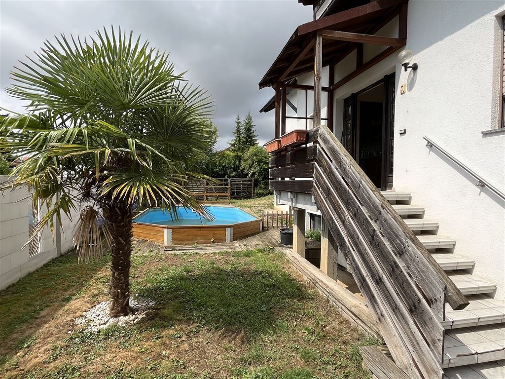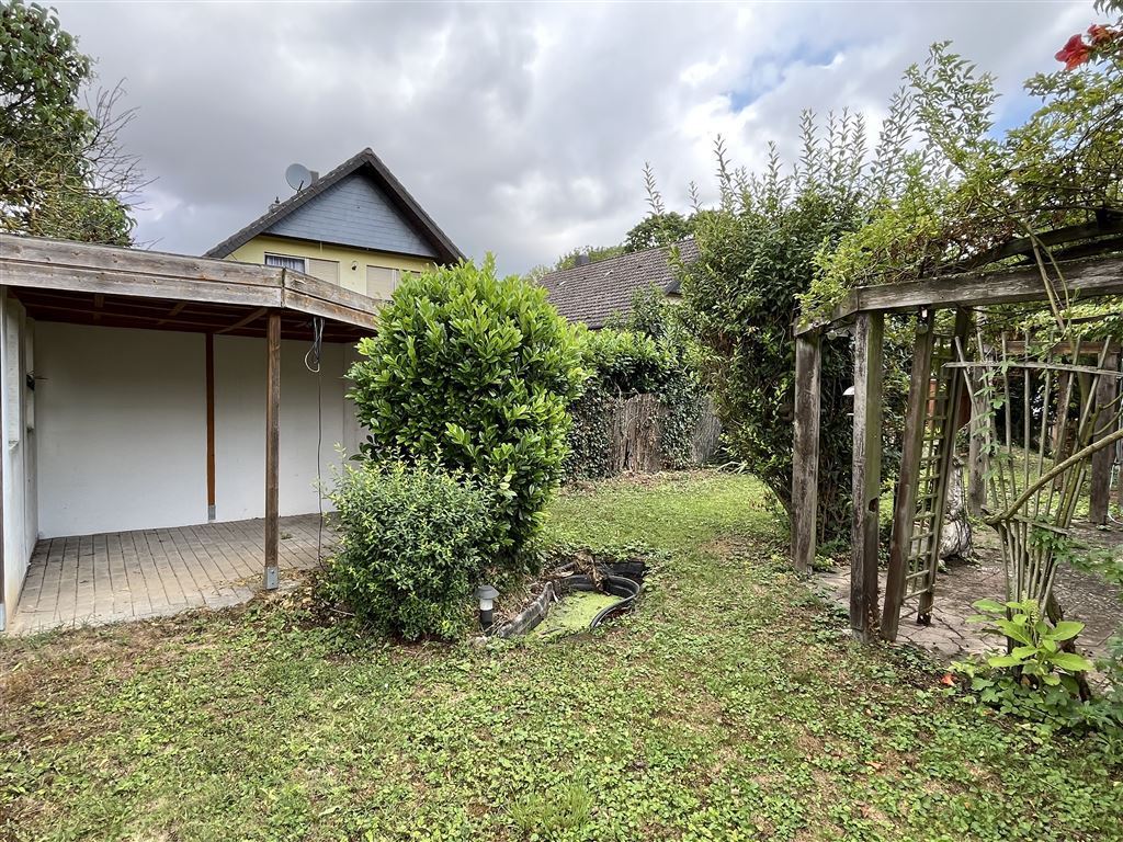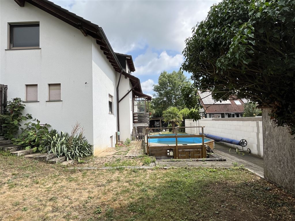 Zum Haus gehört ein Gartengrundstück mit Terrasse, überdachter Freisitz, ein Swimmingpool eine große Doppelgarage, Carport, eine Fertiggarage sowie mehrere Stellplätze.